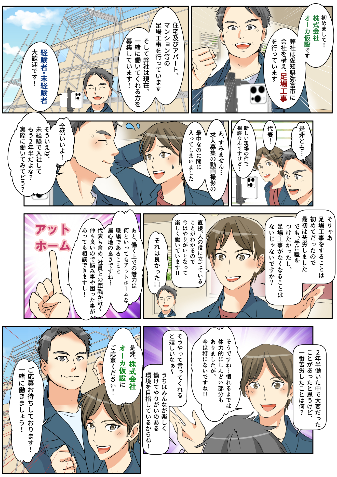 株式会社オーカ仮設は愛知県弥富市にある足場工事をおこなう建設会社です。住宅及やアパートの建設現場など高所で作業員が作業をする際に、足元を支える構造物を設置する足場工事を行っております。現在、当社では業務拡大のため新たな仲間を募集しております。地元地域で働きたい方、建設・足場工事に興味がある方は、お気軽にご応募ください。前向きで真面目に取り組んでくださる方のご応募お待ちしております。